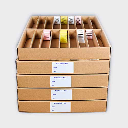 جعبه بایگانی بلوک بافت، یک محفظه اقتصادی و سبک است که برای برای سازماندهی و ذخیره سازی بلوک های بافت پارافینی در آزمایشگاه های پاتولوژی طراحی شده است. این جعبه از مقوای فشرده و باکیفیت ساخته میشوند که در برابر فشار و وزن بلوک ها استحکام مناسبی دارد. طراحی داخلی آن نیز شامل بخشبندی ها یا بلوک های متعدد است که امکان مرتب چیدن و دسته بندی نمونه ها را بر اساس شماره یا تاریخ فراهم می کند. برچسب یا ناحیه لیبل گذاری شده بر روی بدنه جعبه، امکان ثبت اطلاعات مهم مانند شماره نمونه، بازه تاریخی و نام بیمار را برای بازیابی آسان و سریع میسر می سازد.